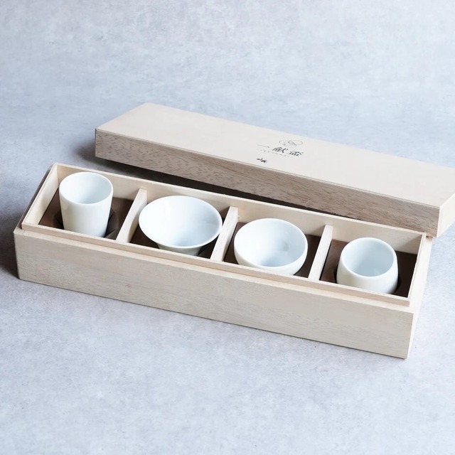 日本酒をもっと身近に楽しんでもらいたいという作り手の思いがこめられた4種の盃。 同じ日本酒も、盃を変えて飲み比べると「あら不思議!」 ワイングラスのように、盃の形によってお酒の香りや味の感じ方が変わります。 こちらのサイズはお酒を少しずつ飲む、利き酒に適したサイズです。 自分好みの形を探したり、利き酒ならぬ、"利き盃"をしたり。 お友達が集まる日本酒会やアウトドアで、 ワイワイと日本酒を楽しんでみてください。 こちらは木箱に入ったセットです。 自分へのご褒美やギフト用としてお使いください。 ストレート:「すっきり、さっぱり」飲める盃 ラッパ:「とにかく香り」を楽しめる盃 ワングリ:「しっかりと旨み」を味わえる盃 ツボミ:「濃厚をチビチビ」と飲める盃 【サイズ】 ストレート:直径45×高さ70(mm) 満水時55cc ラッパ:直径70×高さ55(mm) 満水時55cc ワングリ:直径60×高さ50(mm) 満水時55cc ツボミ:直径50×高さ60(mm) 満水時60cc 【食洗器】〇 【電子レンジ】〇 【パッケージ】木箱入り