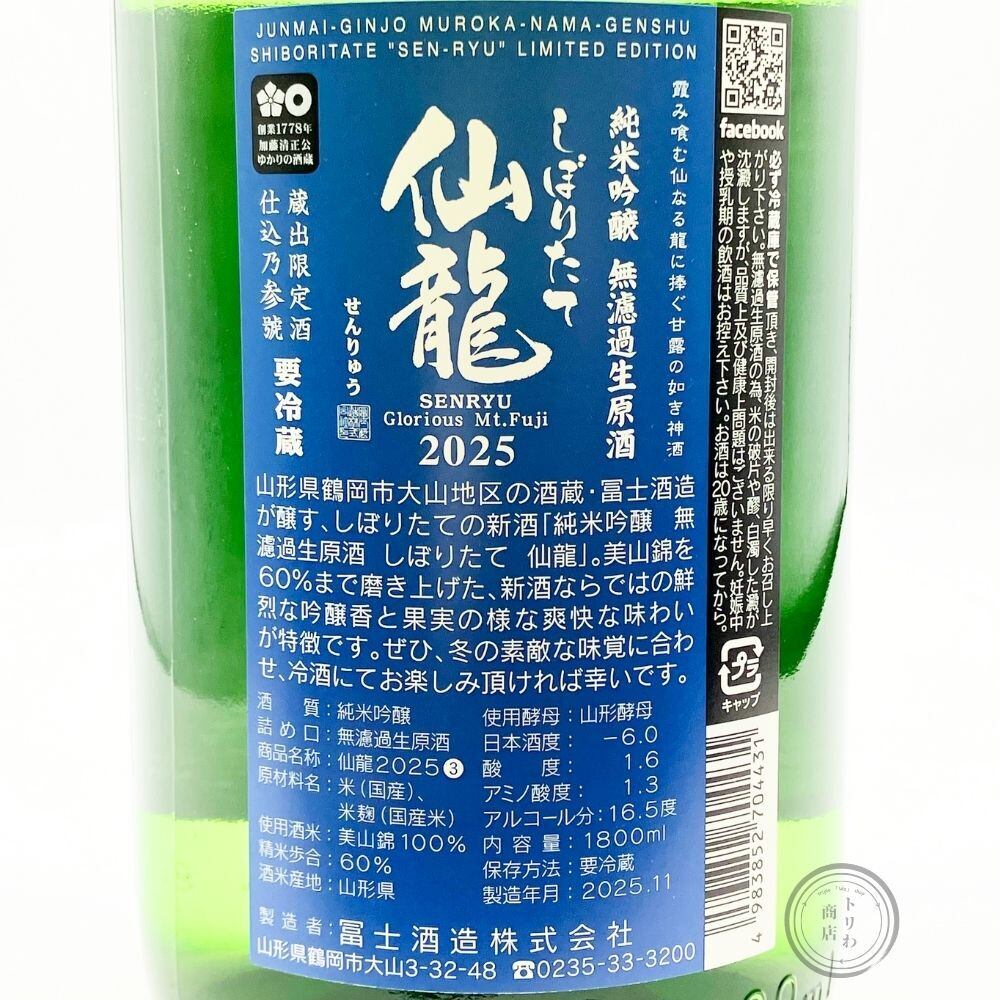 栄光冨士 仙龍(せんりゅう) 純米吟醸 無濾過生原酒 しぼりたて [山形] / 1800 ml