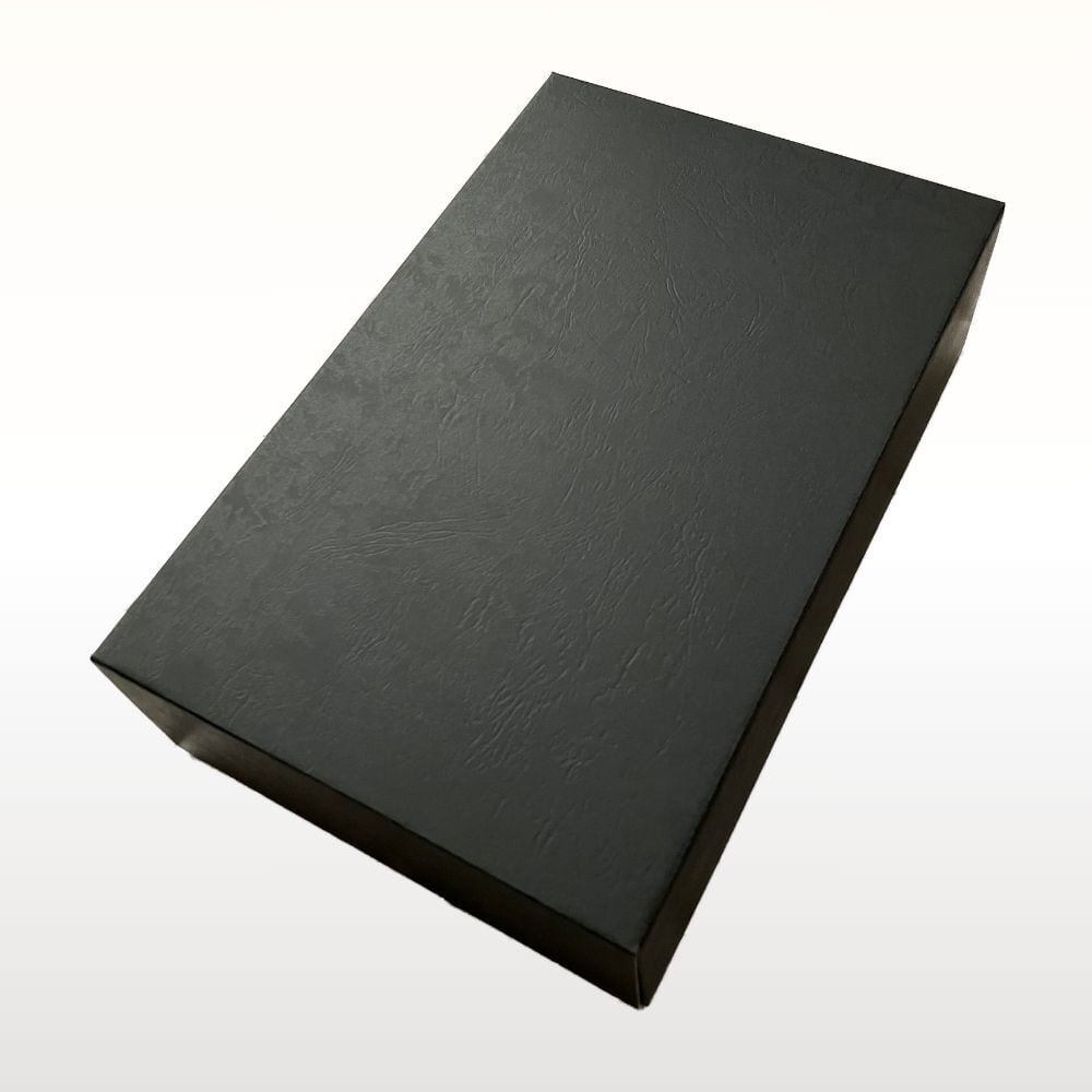 蓋はレザー調の型押しマットな黒、身箱は艶なしの未晒(みざらし)クラフト素材を使用したボックスです。